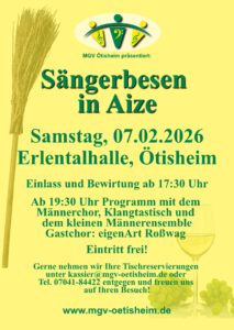 Am Samstag, den 7. Februar 2026, geht der MGV Ötisheim wieder mit Freude in die mittlerweile 20. Auflage seines beliebten Sängerbesens. Um 17:30 Uhr öffnen die Sängerinnen und Sänger die Pforten der Ötisheimer Erlentalhalle und laden ein zu leckeren Besengerichten, Wein und Musik. Ab 19:30 Uhr, wenn die Gäste mit den frischen Schnitzeln aus der Pfanne, Salzfleisch mit Kraut und weiteren Köstlichkeiten versorgt sind, werden dann der gemischte Chor Klangtastisch, das kleine Männerensemble als auch der Männerchor das Publikum jeweils mit einem Auftritt erfreuen. Als Gastchor wird dieses Mal der gemischte moderne Chor „eigenArt“ vom Liederkranz Roßwag auf der Bühne stehen. Der Eintritt ist wie gewohnt frei. Da der MGV Ötisheim wie in den Vorjahren erneut mit vollem Haus rechnet, besteht ab sofort die Möglichkeit, unter 07041/84422 oder per Email kassier(at)mgv-oetisheim.de Plätze für den Sängerbesen zu reservieren.